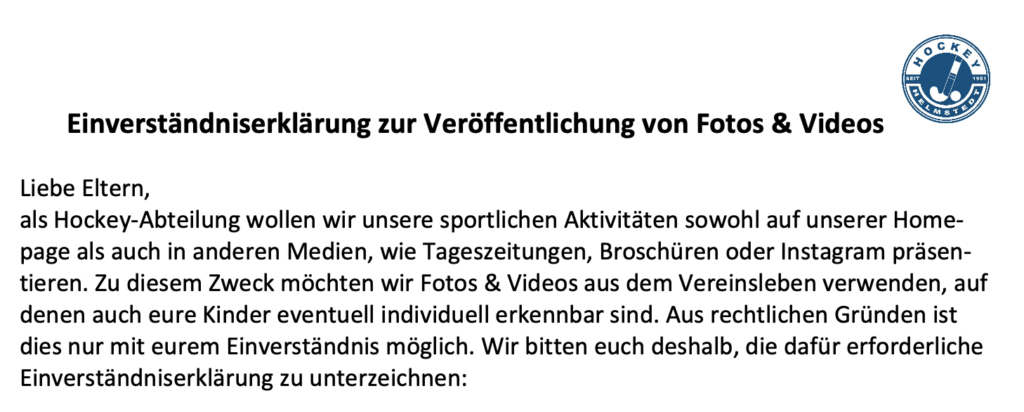 Einverständniserklärung zur Veröffentlichung von Fotos und Videos