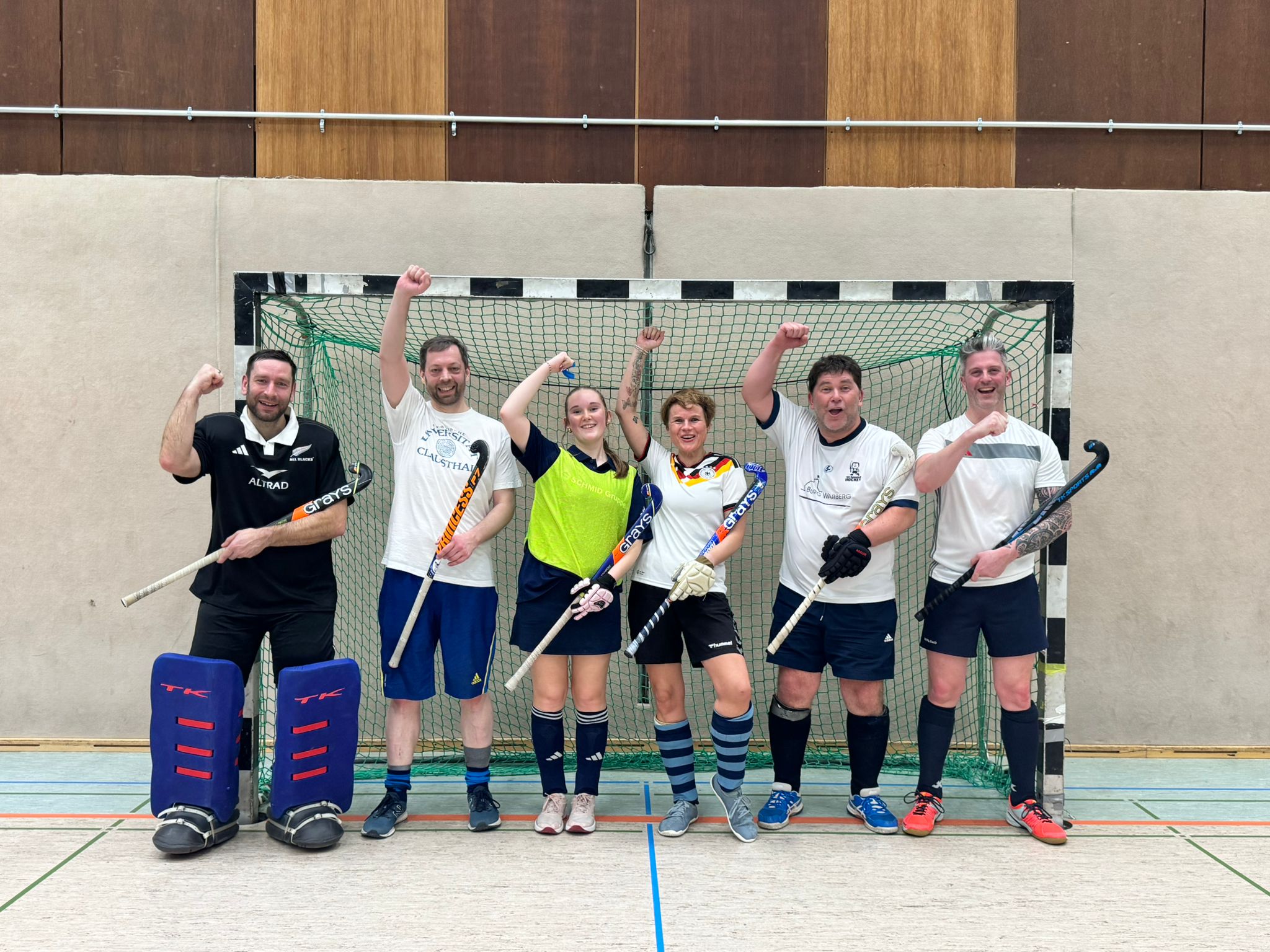 Im April 2026 spielten wir mit einigen Hockey-Neulingen zusammen gegen eine Mixed-Mannschaft aus unserer U12/U14/U16. Das Elternteam gewann knapp mit 8:7!